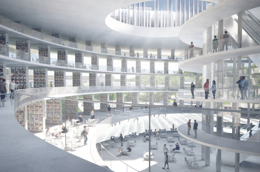 美术馆挑出的屋顶,以及与邻近的图书馆统一的石材立面,将两个建筑从视觉上联系起来。屋顶象征着通往知识、艺术与文化的大门,中间的大广场在访客、建筑与城市之间提供对话空间……美术馆的玻璃立面部分,赋予其开放、邀请的姿态。展览层呈阶梯状排布,连接至玻璃中庭,形成可以眺望城市、俯瞰广场的平台。